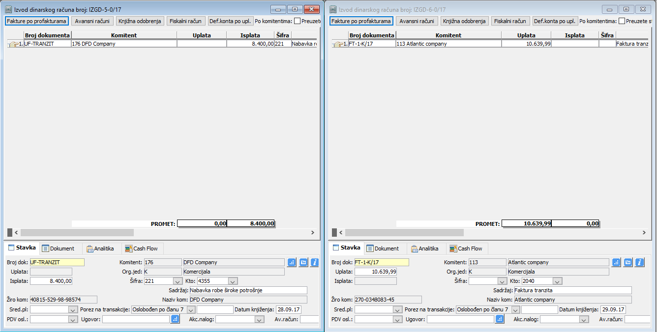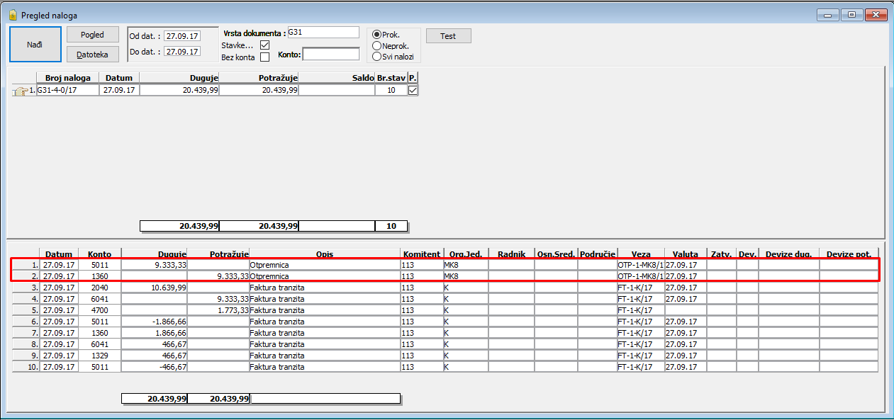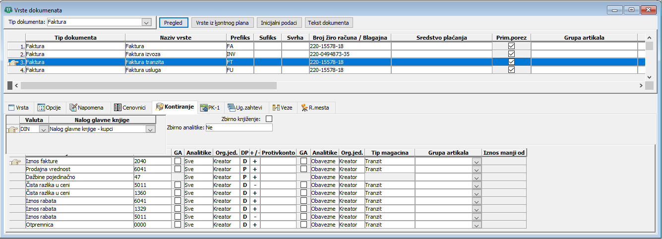 Prilikom knjiženja izlaznih faktura omogućeno je paralelno automatsko knjiženje vezane otpremnice u gavnu knjigu. Tom prilikom će nalogu za knjiženje izlazne fakture tranzita biti pridodate i knjižne stavke otpremnice - oba naloga će biti spojena u jedan nalog. Ovu funkciju aktivirate dodavanjem knjižne stavke "Otpremnica" u kontnu šemu izlazne fakture, (vidi sliku)