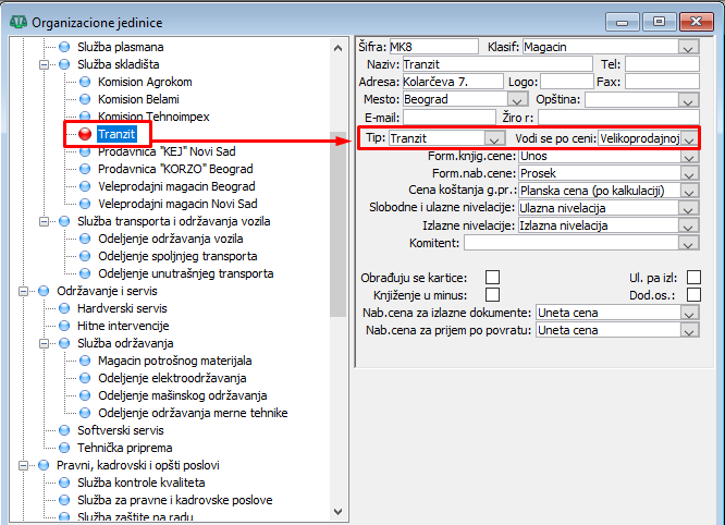 Definišite novu organizacionu jedinicu "Tranzit": 1. postavite tip magacina u polju "Tip:" na "Tranzit"; 2. Postavite opciju "Vodi se po ceni:" na vrednost "Velikoprodajnoj"; 3. isključite polje za potvrdu "Obrađuju se kartice:", ( vidi sliku )